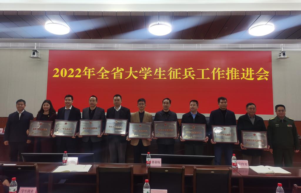 2月10日,省教育厅召开2022年全省大学生征兵工作推进会。省教育厅二级巡视员邱克楠,省征兵办副主任、省军区动员局副局长宋纯武出席会议。会议传达了全国征兵工作会议精神,对我省高校2021年度征兵工作作了全面总结,对今年征兵工作进行了周密部署,并对2021年度高校征兵工作先进单位和先进个人进行了表彰。我校被评为2021年度征兵工作先进单位,武装部邓伟昌部长被授予"征兵工作先进个人"称号。