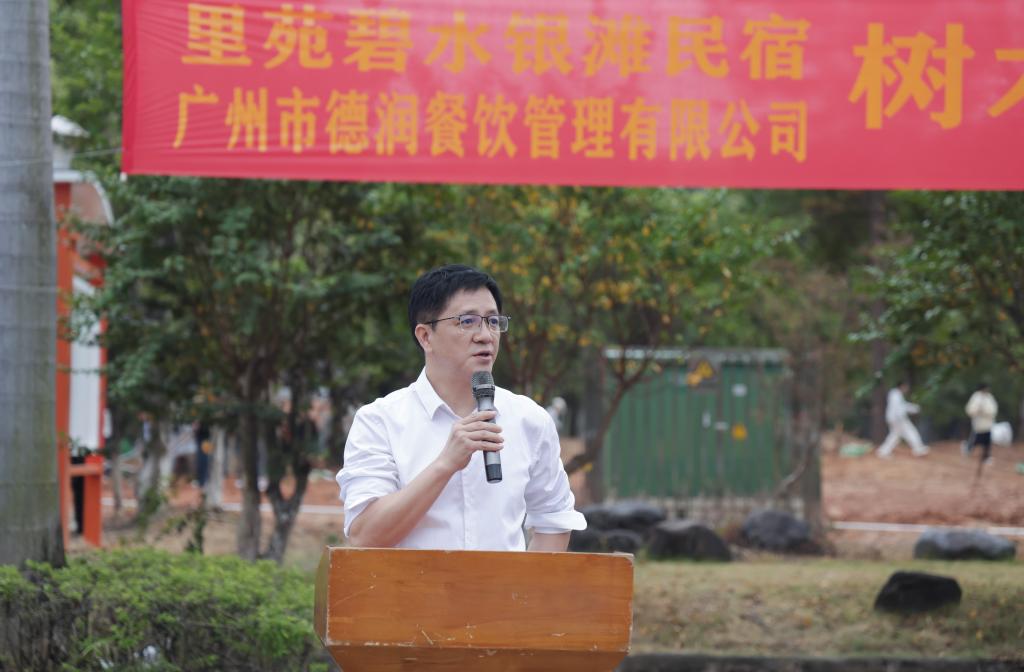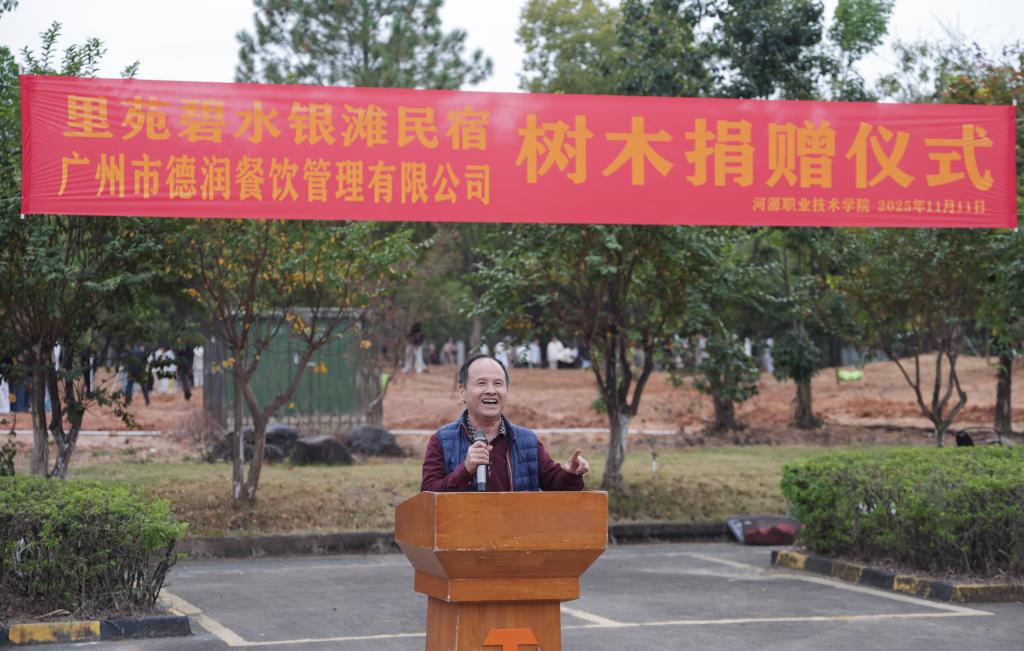 捐赠方代表、东源里苑碧水银滩民宿总经理张鑫在发言中深情回顾了多年前到访河职院的经历。他表示,此次重返校园,欣喜地发现学校面貌焕然一新,环境优美,学生充满活力。他承诺将持续支持学校绿化建设,未来将继续捐赠树木,助力打造更加美丽的校园环境。