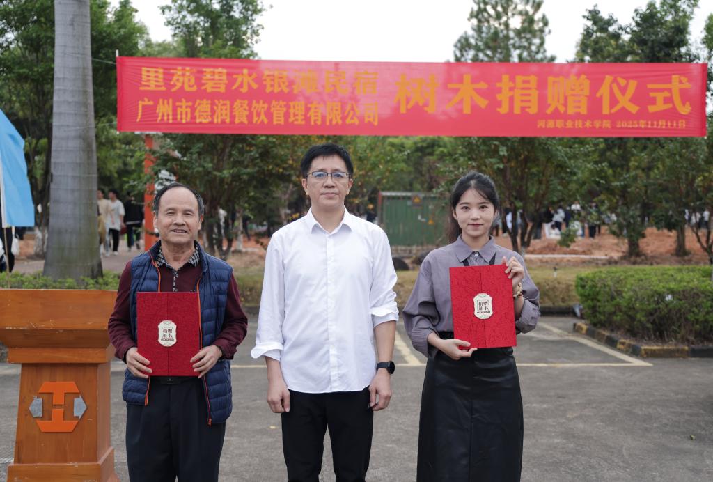 广州市德润餐饮管理有限公司代表黄丽芳女士、徐翠娟女士也出席了仪式。作为学校第一食堂的运营单位,该公司在校庆之际捐赠树木,以实际行动表达对学校发展的支持与祝福。仪式上,刘贻新校长为张鑫总经理及德润餐饮公司代表颁发了捐赠证书,并合影留念。本次仪式共获赠黄花风铃木20棵。其中,东源里苑碧水银滩民宿张鑫总经理慷慨捐赠15棵,价值约两万元;广州市德润餐饮管理有限公司捐赠5棵,价值六千余元。这两批树木将为校园增添一道亮丽的风景线。