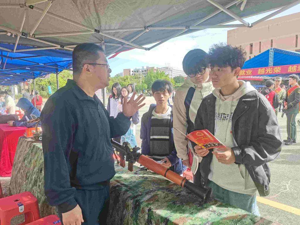 为响应国家号召,激发青年学子报国热情,11月21日,学校武装部在河源市2025年“百万英才汇南粤”暨高校毕业生“就”在金秋,“职”达未来校园招聘活动中开展“携笔从戎 强军有我”征兵宣传活动,刘贻新校长亲临现场指导。