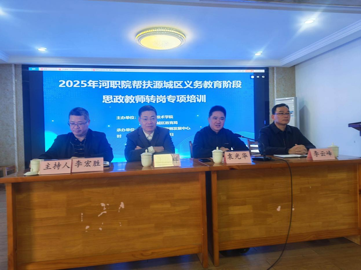 11月22日上午,源城区义务教育阶段中小学思政教师转岗专项培训开班仪式在区教师发展中心四楼讲学厅隆重举行。源城区教育局党组成员、区教师发展中心主任李宏胜主持仪式,源城区教育局党组成员、副局长李云峰,我校袁光华副校长、老隆师范学院杜伟祥院长出席仪式,全区义务教育阶段60名教师参加了此次转岗培训。