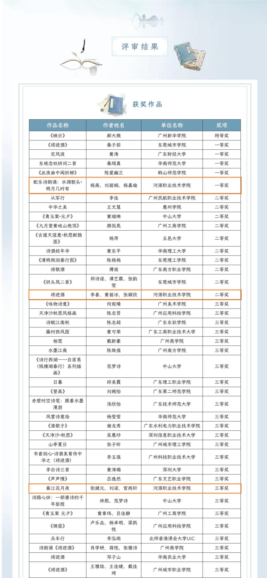11月25日,首届广东省高校“书香浸润”中华诗词美育作品创作大赛结果揭晓,我校图书馆作品获广东省高校中华诗词美育作品创作大赛一等奖。