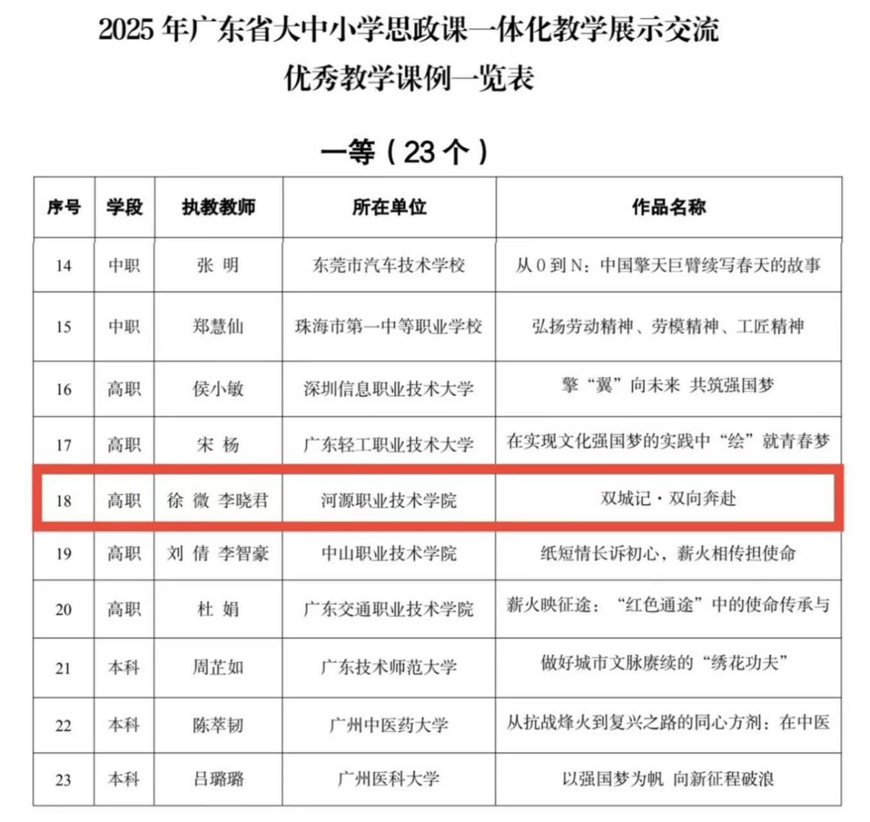 近日,在2025年广东省大中小学思政课一体化教学展示交流活动中,我校马克思主义学院徐微、李晓君教师团队报送的作品《双城记·双向奔赴》荣获高职组“优秀教学课例”一等奖。该奖项代表我省高职院校在思政课教学创新方面的最高水平之一,体现了我校在“大思政课”改革中的领先地位。