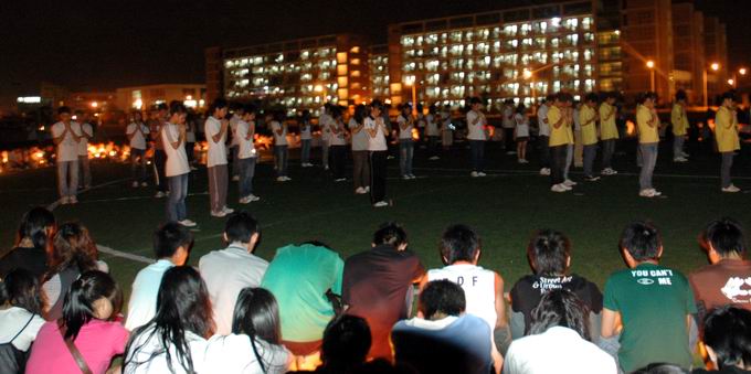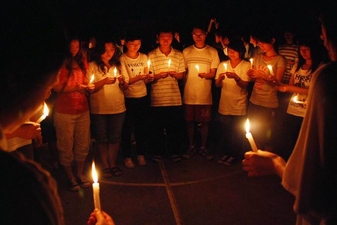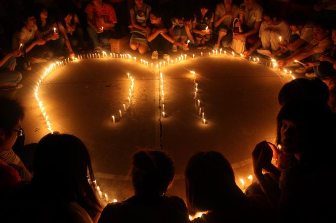 “风再大,只要我们并肩站在一起,火就不会灭”,正是有了这样的力量,让汶川人民有了勇气与信心。12日晚,我校篮球场、贤能广场等地聚集了广大学子,他们纷纷点起蜡烛,为在汶川地震中的逝者默哀,为四川人民祈福。07工业环保与安全技术的活动负责人说到:“家园毁了,可以重建,可是心碎了,却不能重拼。只愿可以给灾区的人们多一点的爱心,让他们重振精神,勇敢地活下去。”他说,在去年地震发生的第二天,他们班就在河源市区筹划募捐了六千多元,及时为灾区人民送去爱心。