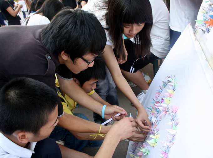 “折一只纸鹤,传一些祝福,送一份关爱”,我校电信电子与信息工程系、爱心协会、和08服装设计(2)班与08高分子班在桃李园及宿舍区内分别进行了“飞鹤传情,祝福汶川”活动。于是,校园爱心溢浓,桃李园飞鹤群飞、祝福满园,同学们给四川人们送上了暖暖的爱心和深深的牵挂。08服装设计(2)班则在画板上用纸鹤拼成“心”并贴上祝语表达了对地震灾区人民的悼念和关爱。