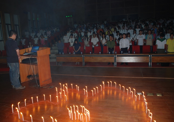 会上,首先由到场观众为汶川地震死难者默哀一分钟。随后,在由蜡烛组成的四川地图的烛光中郑衍华为我校师生展示了由南方都市报和南方日报摄影记者以及摄影爱好者们拍摄的关于地震主题的相片集,通过影像的方式回顾了5.12大地震的震撼场面、灾后重建工作和灾民的生活情况,让我们永远铭记5.12大地震。追思会在播放陈道明的诗歌朗诵作品《废墟上的敬礼》的视频后结束。