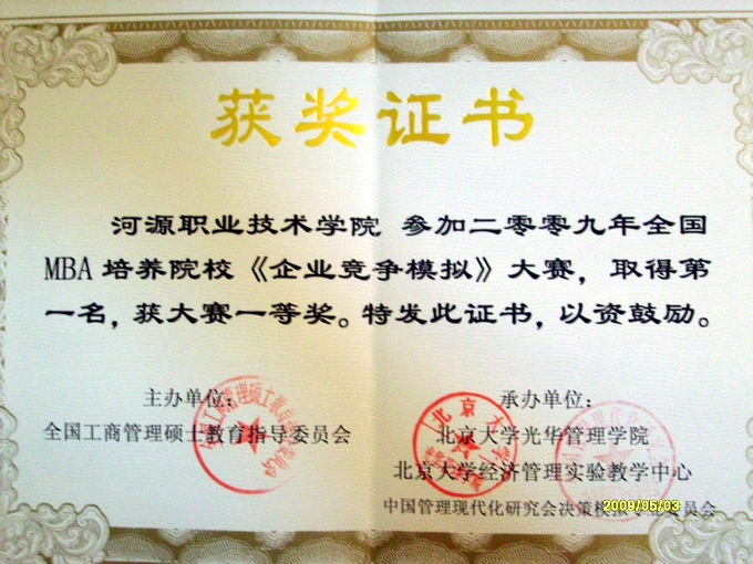 2009年5月2日,由全国MBA教育指导委员会主办、北京大学光华管理学院承办的第八届“全国mba培养院校企业竞争模拟大赛” 在北京大学光华管理学院圆满结束,我校“狼腾有限公司”代表队最终力挫群雄,夺得第一名。北京大学MBA代表队和合肥工业大学MBA代表队分别获得了本次大赛的亚军和季军。我校其他三个代表队获得了全国二等奖。