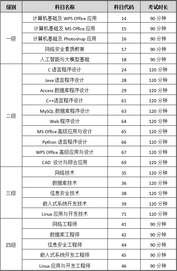 2026年3月全国计算机等级考试开考科目(IM在线登录考点)