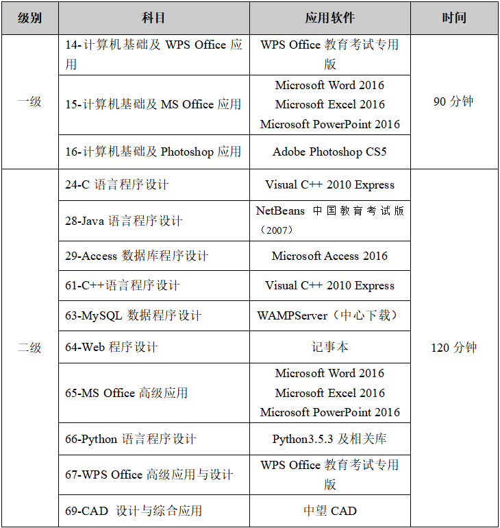 NCRE各科目考试软件列表