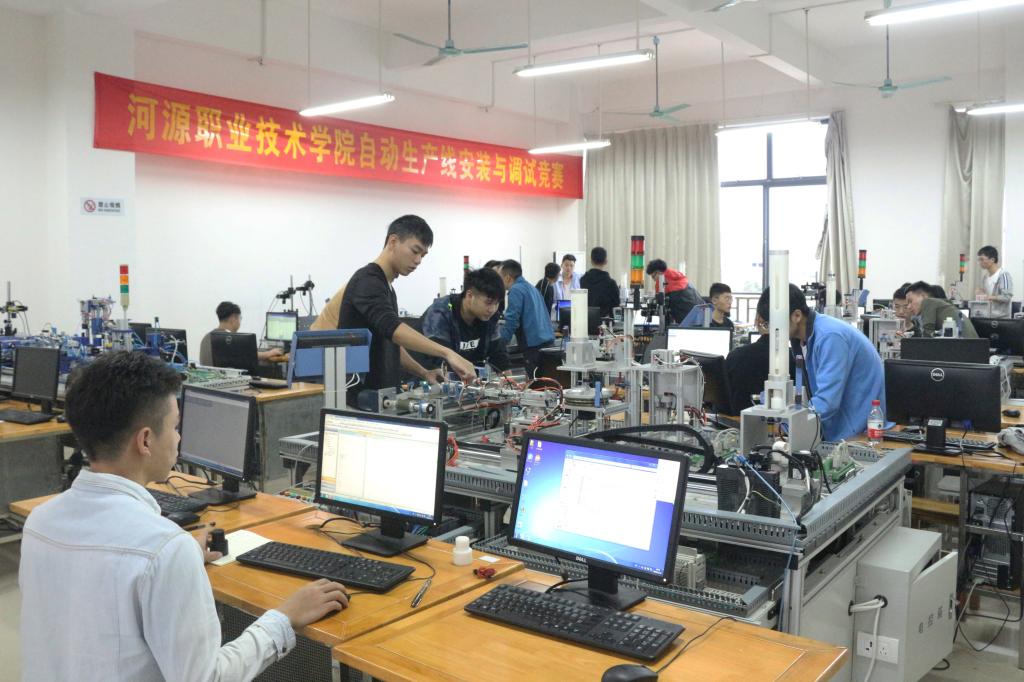 技能竞赛以四人为一队进行,选手们现场操作“自动生产线实训考核装置”,完成自动生产线设备部分工作单元的电气控制电路的设计、安装和布线,传感器安装与调整,PLC编程,人机界面组态,电机驱动参数设定,以及系统统调、运行等内容。