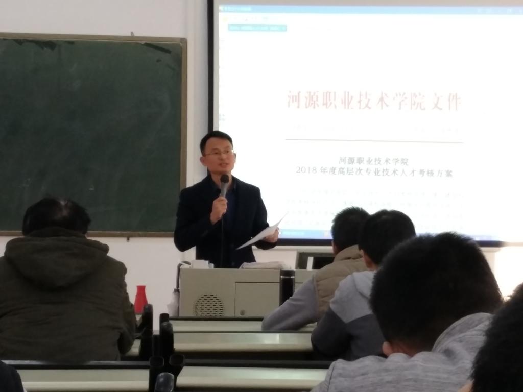 会上,钟建坤院长首先传达了学校关于高层次专业技术人才考核工作的精神,着重介绍了学校2018年度考核方案与上年度考核方案的主要变化,并要求考核人员按要求做好考核工作。