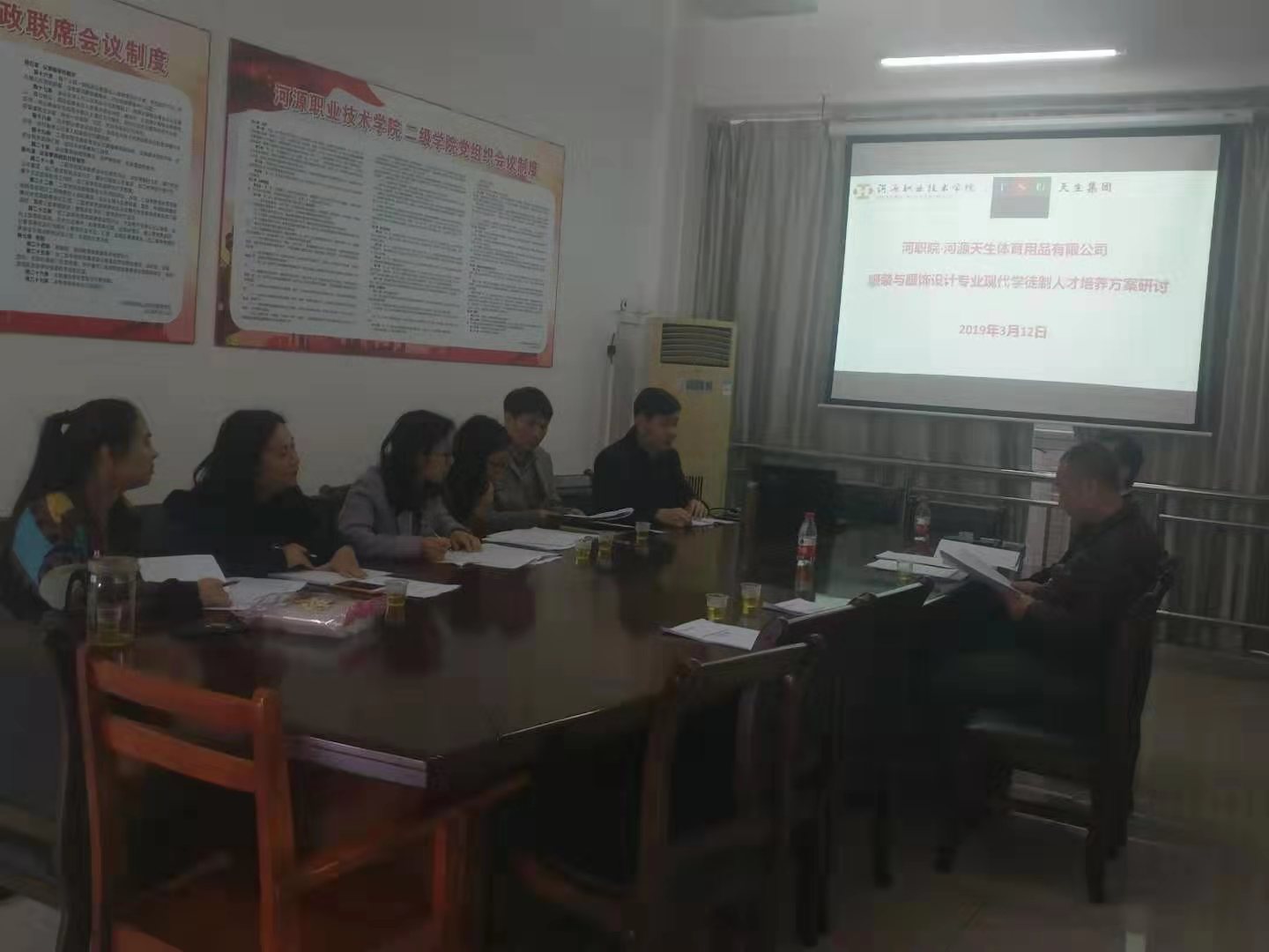 3月12日上午,我院在艺术楼A202召开了服装与服饰设计专业现代学徒制人才培养方案制订研讨会。艺术与设计学院院长杜伟祥、副院长王方、服装与服饰设计专业主任高晓杰及专业老师、河源天生体育用品有限公司总经理袁诗洪及公司技术人员出席本次会议,会议由杜伟祥院长主持。