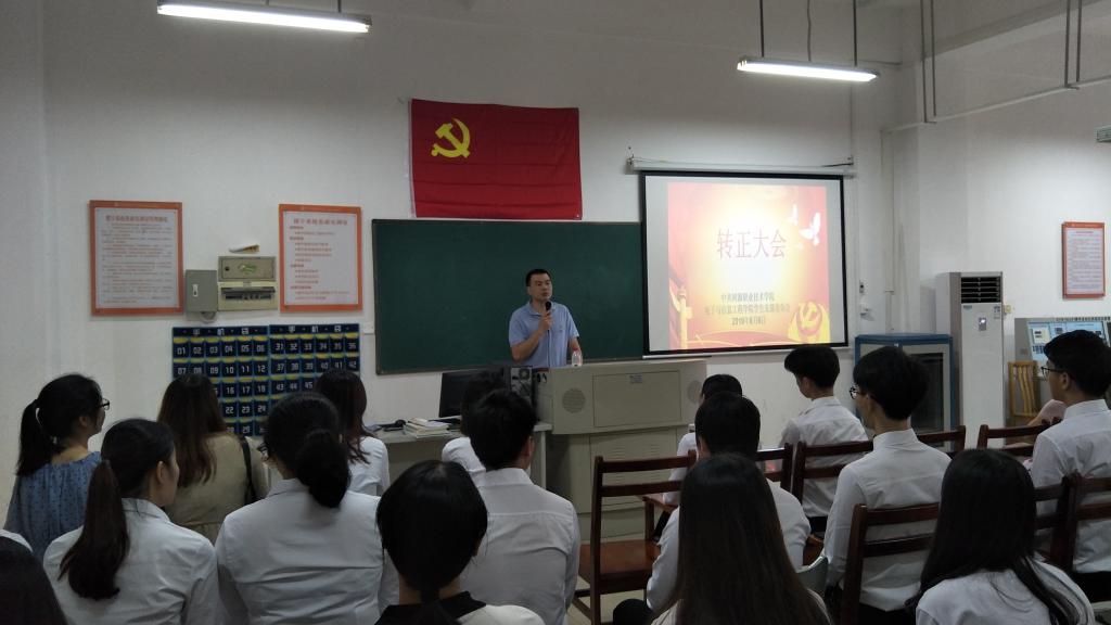 6月6日下午,电信学院于实训楼A216召开2019年上半年预备党员转正大会。参与本次大会的人员有:学院学生组织部成员、学生党支部全体成员、预备党员待转正成员,大会由学生党支部书记杨日奎主持。