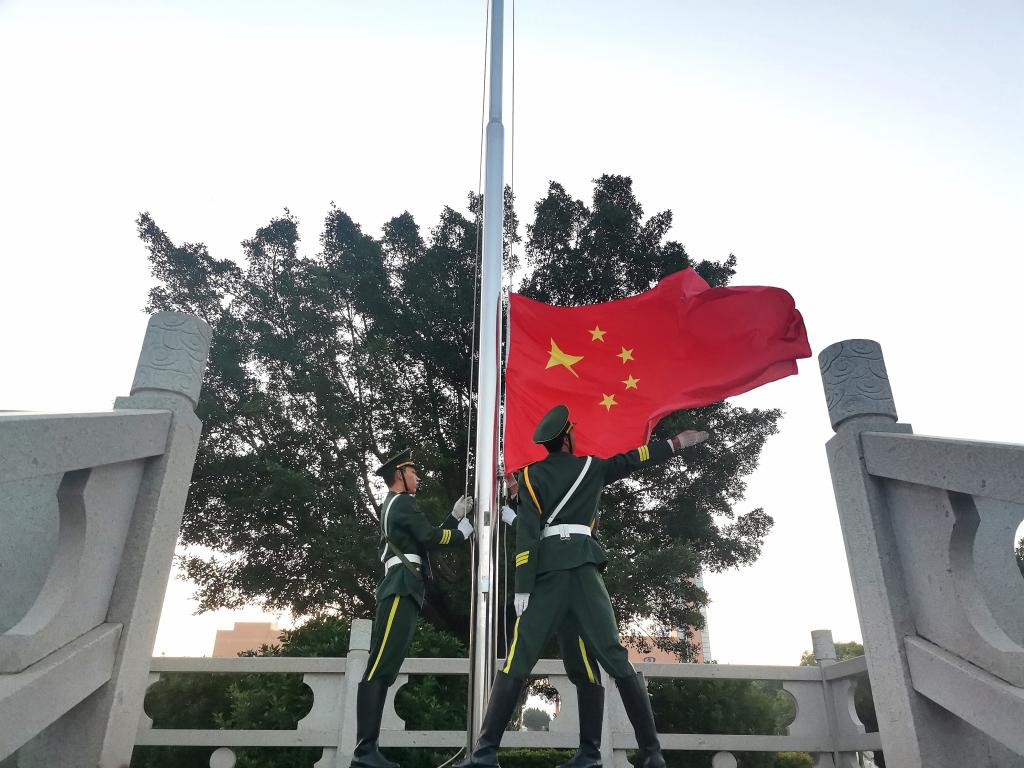 7点30分,国旗护卫队准时出旗,升国旗、奏国歌,鲜艳的五星红旗迎着清晨的微风和骄阳冉冉升起,随风飘扬。