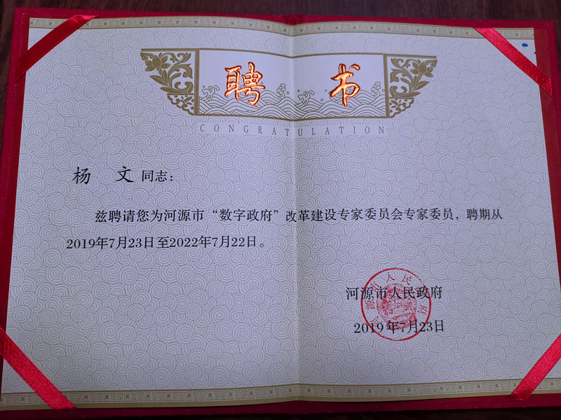 近日,河源市“数字政府”改革建设工作小组办公室发布通知,为进一步提升我市“数字政府”改革建设工作科学化水平,充分发挥专家学者的智力支持作用,市人民政府决定成立河源市“数字政府”改革建设专家委员会,我校信息中心主任杨文受聘为专家委员。