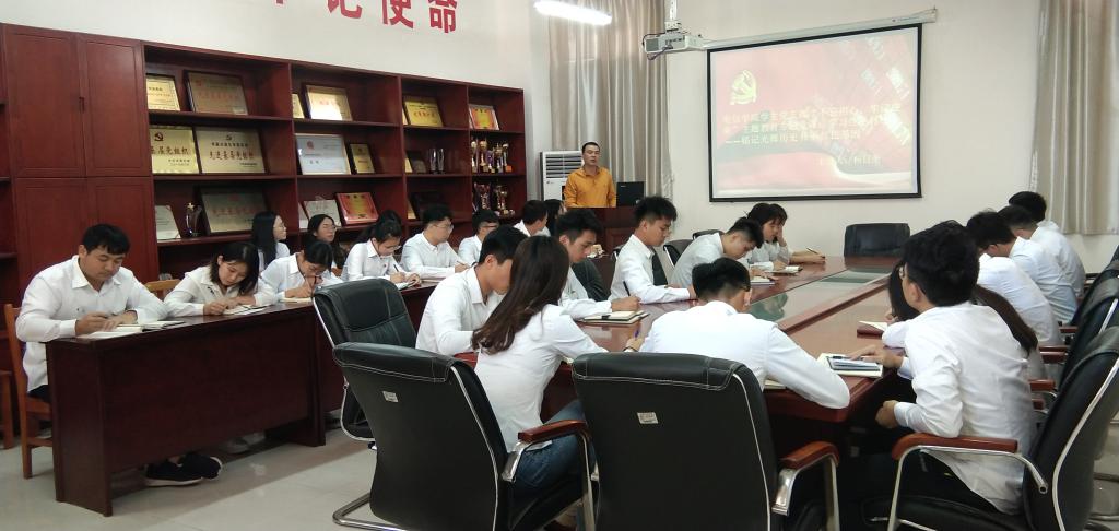 2019年11月12日下午,电信学院学生党支部在实训楼B307开展“不忘初心、牢记使命”主题教育专题党课:学习红色村庄——铭记光辉历史、传承红色基因。参与人员有学生党支部全体党员、负责学生党务工作全体成员,学生党支部书记杨日奎担任主讲。