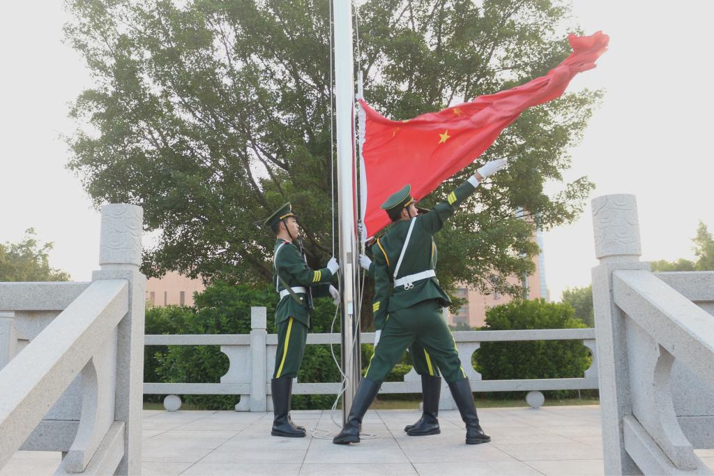 七点三十分,国旗护卫队准时出旗,伴随着《义勇军进行曲》的响起,升旗手振臂一挥,鲜艳的五星红旗迎着朝阳冉冉升起,随风飘扬。