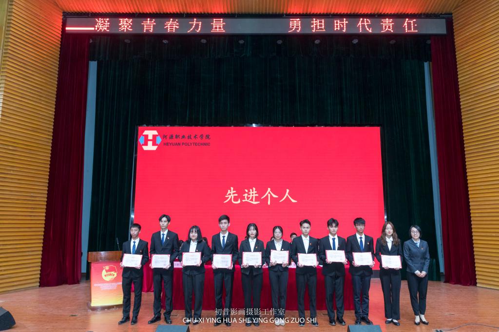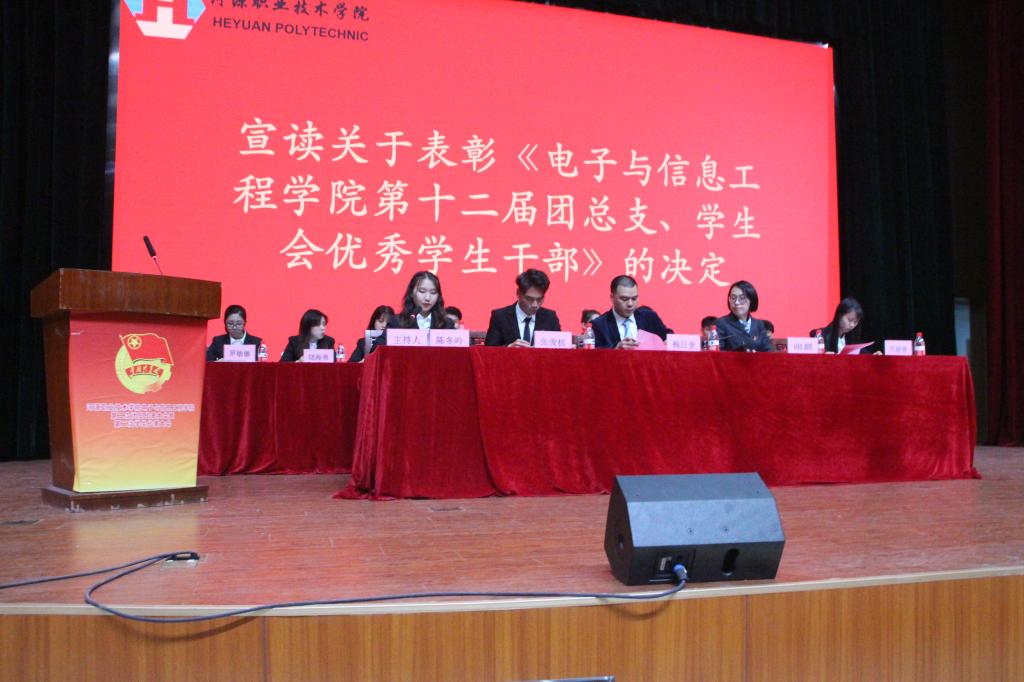 团总支副书记邓丽青宣读关于表彰《电子与信息工程学院第十二届团总支、学生会优秀学生干部》的决定。由团总支书记杨日奎为电信学院第十二届团总支学生会主席团成员及电信学院第十二届团总支学生会各部门部长颁发聘书。