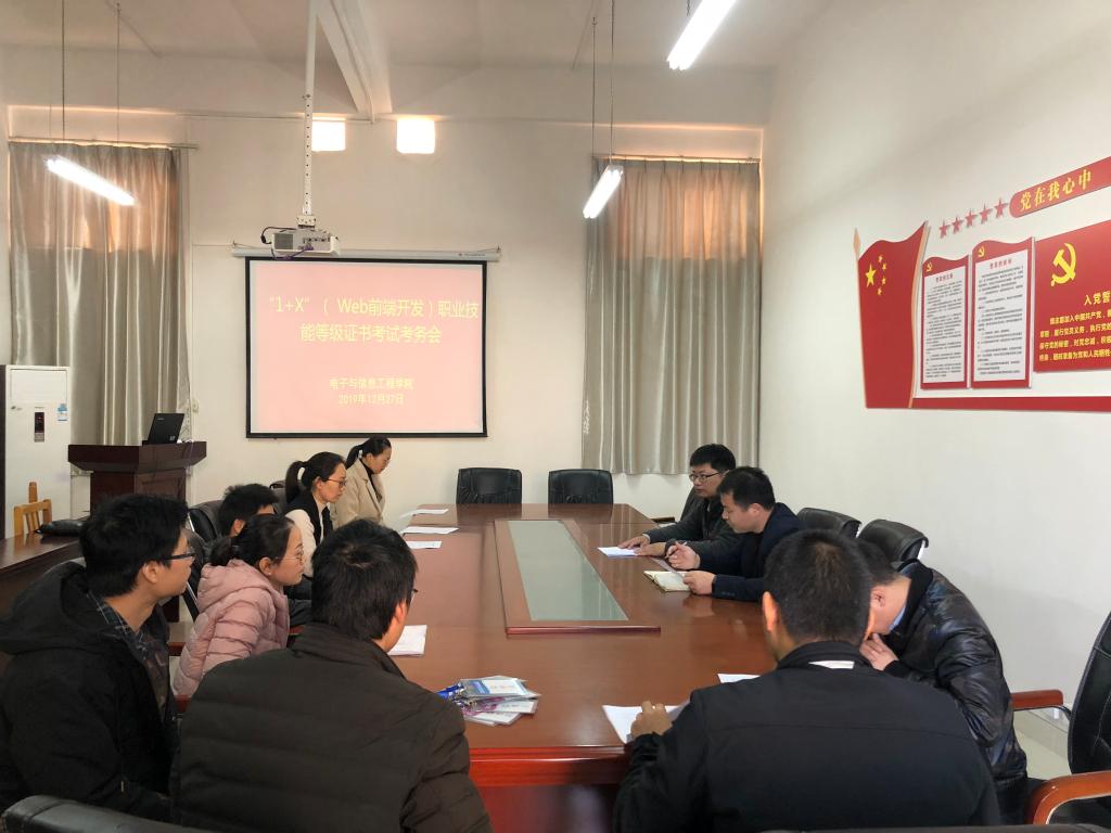 五是召开Web前端开发职业技能等级证书考务会。2019年12月27日,我院在学院会议室召开了“1+X”(Web前端开发)职业技能等级证书考试考务会。会上,周永福副院长就本次考试各岗位职责、考试要求与安排做了详细的说明,并要求大家各司其职、各负其责,确保本次考试的顺利进行。