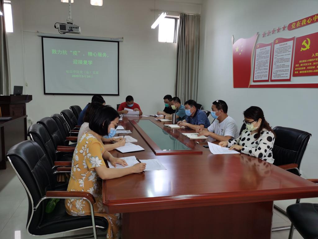 根据学校关于学生返校的通知要求,落实落细疫情防控工作,确保学生返校各项工作顺利开展。5月18日上午,电信学院在实训楼A308召开2020届毕业生返校准备工作会议,王富宽院长、周永福副院长及全体辅导员参加了此次会议,会议由徐国辉副书记主持。