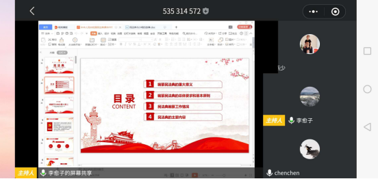 为庆祝建党99周年,7月1日晚,人文学院邀请法律事务专业李愈子老师为全院教职工讲授《中华人民共和国民法典》(以下简称民法典)专题讲座,因疫情防控原因,讲座采用腾讯会议形式进行。