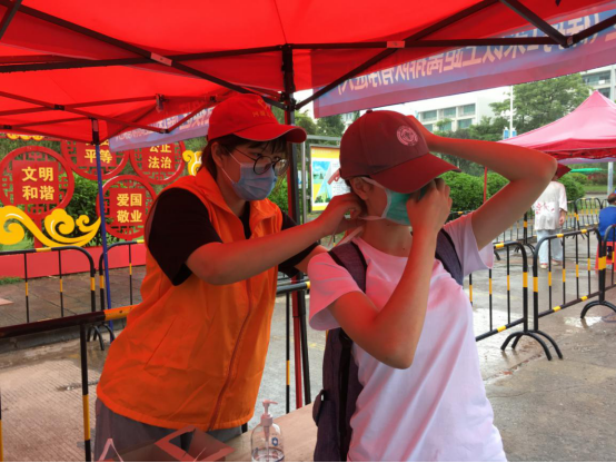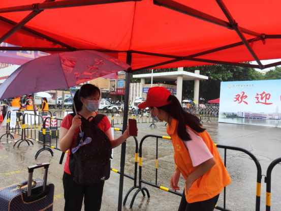 返校学生到达学校东门后,在志愿者的指引下有序排队,依次经过扫码验证、行李消杀、更换口罩、体温检测等环节,最后提交健康卡到辅导员处后进入校园。志愿者们在引导学生完成检查工作时,还积极协助学生搬运行李。