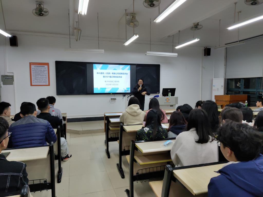 12月22日晚上,电信学院在教学楼C103召开中兴通讯(河源)有限公司招聘宣讲会暨订单班动员会。会议由校企合作办主任高燕主持,中兴通讯南京总部吴晓庆经理、河源基地黄海波经理先后上台宣讲,移动通信技术专业主任谢志能和2021届移动通信技术、应用电子技术等专业的一百六十多位学生参加了会议。