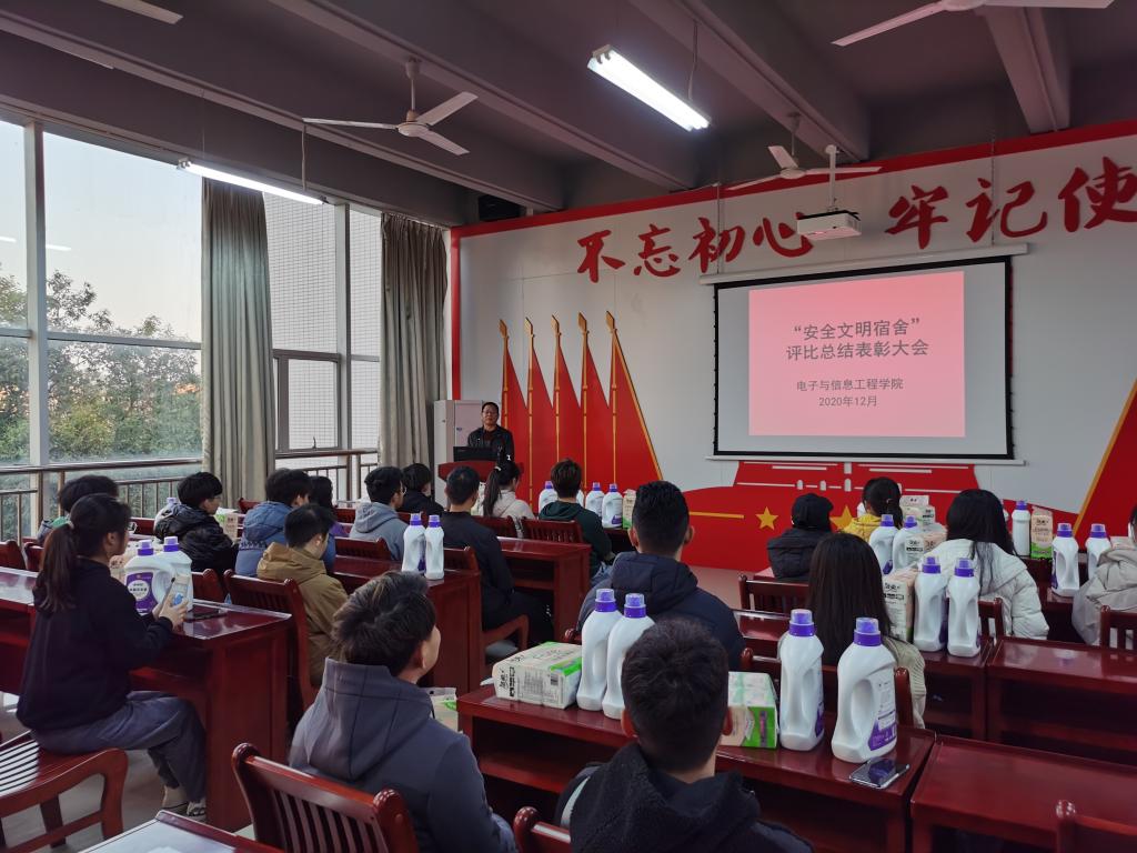 12月30日,电子与信息工程学院在实训楼B306召开“安全文明宿舍”评比总结表彰大会,学院王富宽院长、徐国辉副书记、全体辅导员与获奖宿舍代表出席本次大会。