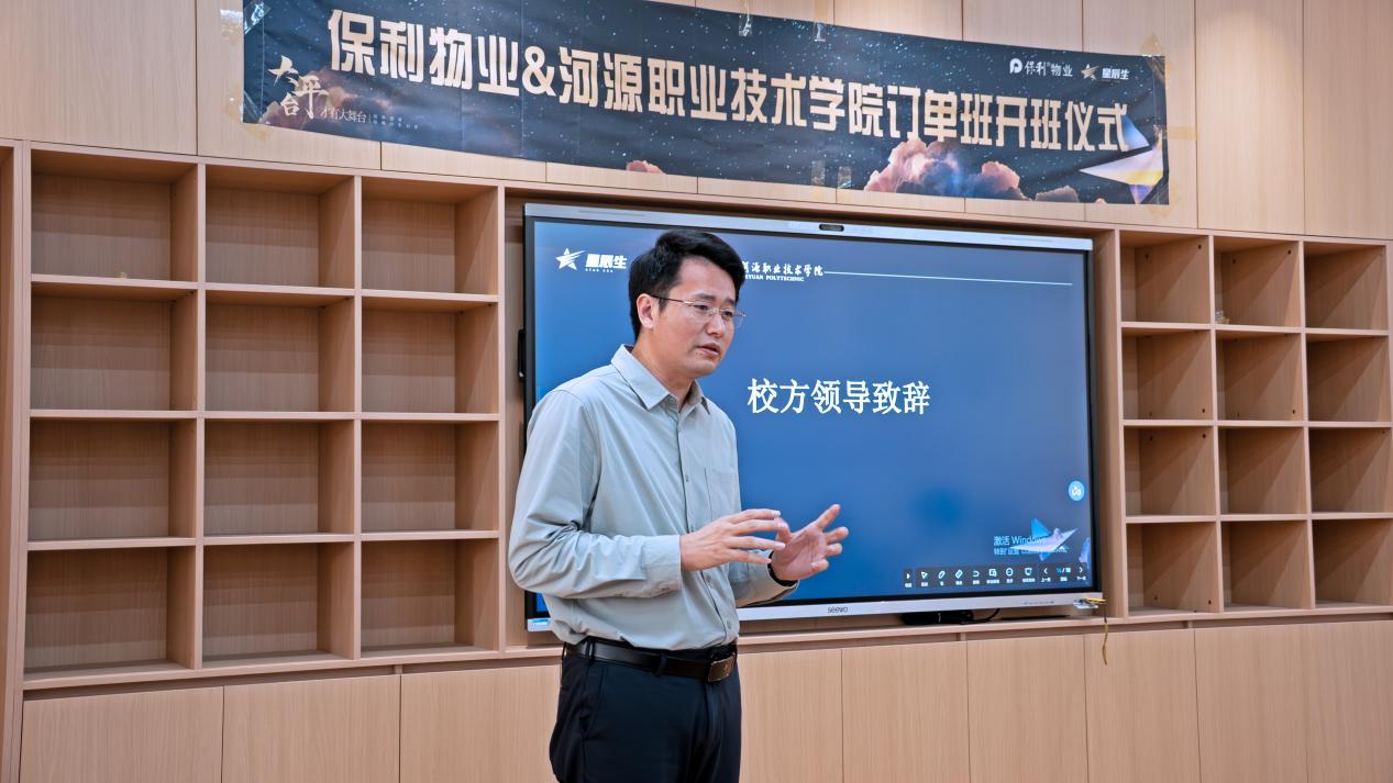 2025年11月6日,我校在工商管理学院数字物业与社区体验中心举行第二届“星辰生订单班”开班仪式。工商管理学院负责人张颖和现代物业管理专业教师,保利物业粤湾公司副总经理谭有珍、党群人力部门经理陈路生等企业代表,以及第二届订单班学员参加开班仪式。