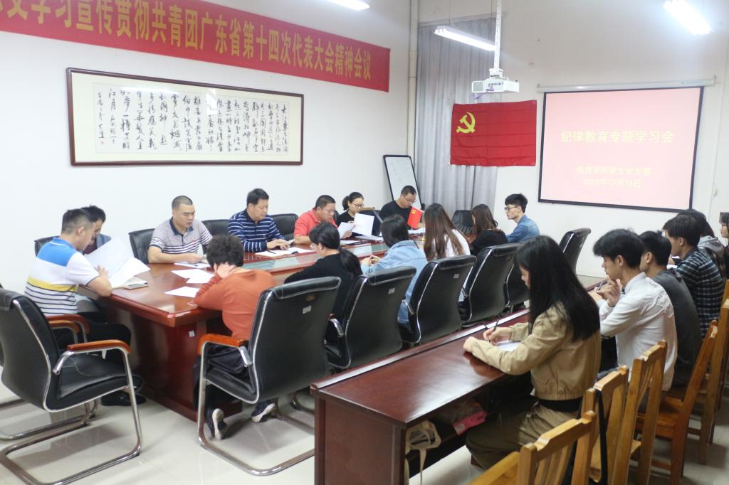 2018年10月16日上午,电信学院学生党支部在实训楼A208召开纪律教育专题学习会,陈农心副校长、电信学院学生党支部全体党员出席本次学习会活动,会议由学生党支部书记杨日奎主持。