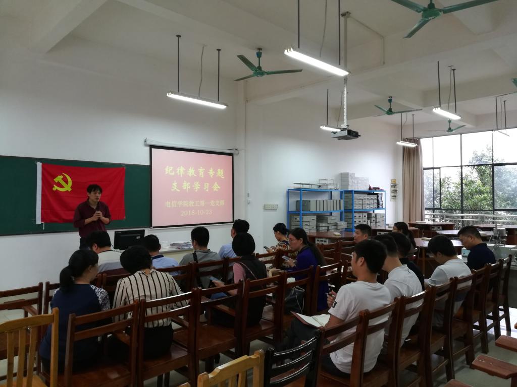 10月23日下午,电信学院教工第一党支部在实训楼A214召开纪律教育专题学习会,支部全体党员出席本次学习会,活动由支部书记黄舒同志主持。