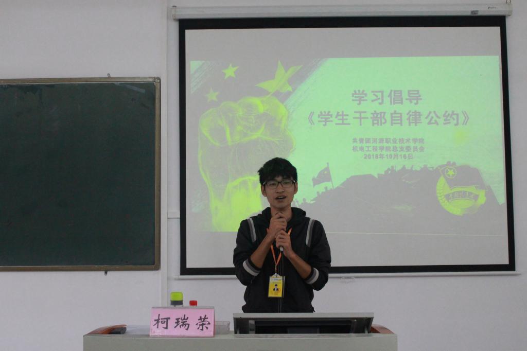 10月16日下午,机电学院在实训楼D311召开2018级新生《学生干部自律公约》学习暨班团干部工作会议。学院团总支书记杨成、团学组织干部代表、2018级各班团干部参加此次活动,活动由团总支书记杨成主持。