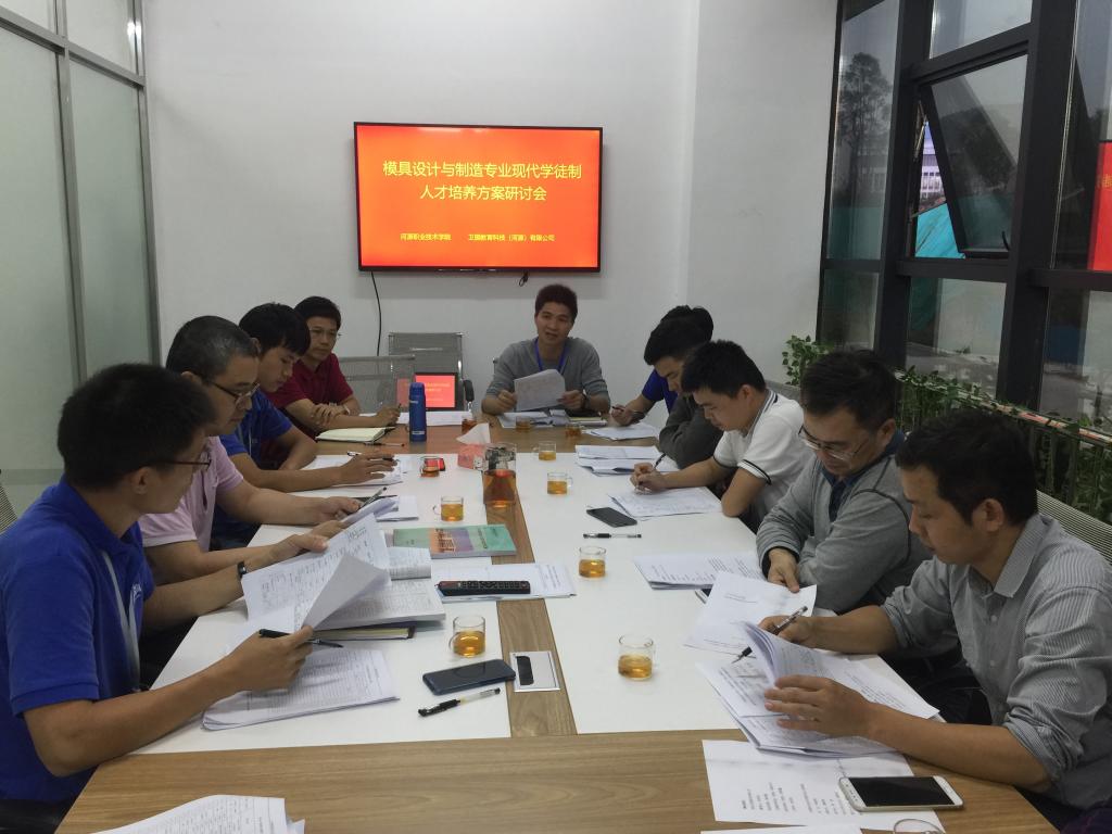 首先,梁丰主任对模具专业现代学徒制人才培养方案进行解说,并说明了此次研讨会的主题,为模具专业现代学徒制班制定教学规划,进一步做好人才培养工作。接着,校企双方就学生毕业条件、现代学徒制班的职业岗位、课程体系、考核标准等展开深入研讨。