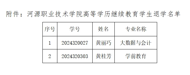 根据教育部《普通高等学校学生管理规定》(中华人民共和国教育部令第41号)和《广东省教育厅关于规范高等教育在校生学籍数据管理的通知》(粤教高函〔2015〕27号)要求,鉴于黄丽巧等2名学生因个人原因提出退学申请,经学院审核,决定对黄丽巧等2名学生作退学处理,现将名单予以公示(详见附件)。