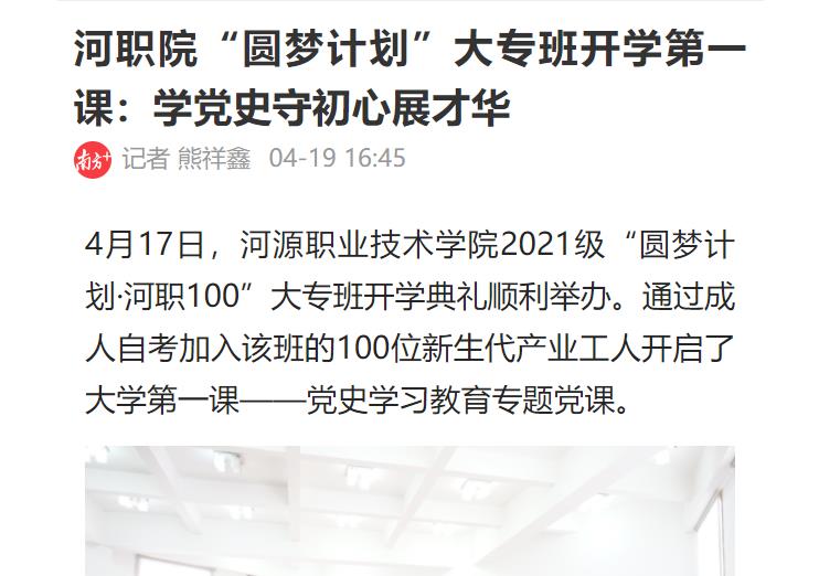 2、2021年4月19日,南方报业集团南方+报道《河职院“圆梦计划”大专班开学第一课:学党史守初心展才华》