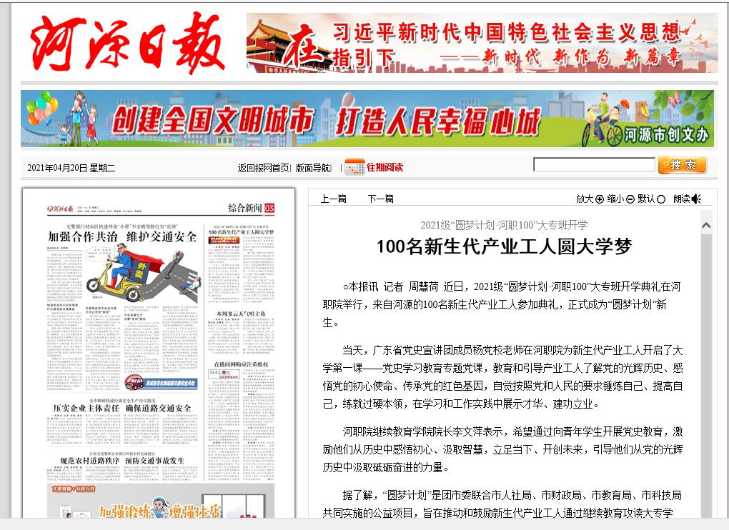 4、2021年4月20日,河源日报报道《100名新代产业工人圆大学梦》