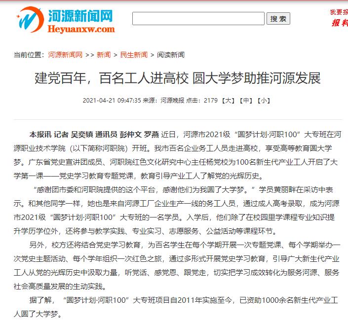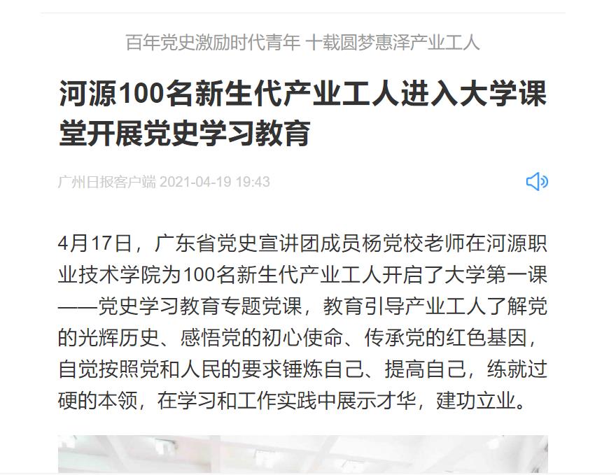 1、2021年4月19日,广州日报报道《河源100名新生代产业工人进入大学课堂开展党史学习教育》