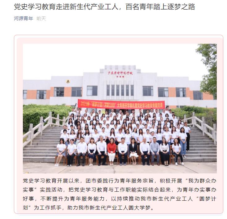 5、2021年4月19日,河源青年微信公众号报道《党史学习教育走进新生代产业工人,百年青年踏上逐梦之路》