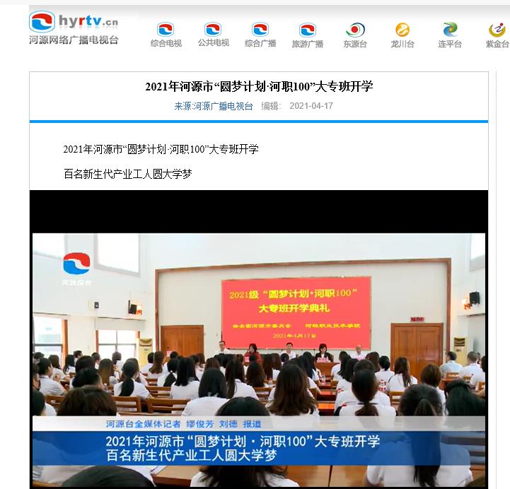 3、2021年4月17日,河源电视台报道《2021年河源市“圆梦计划·河职100”大专班开学》