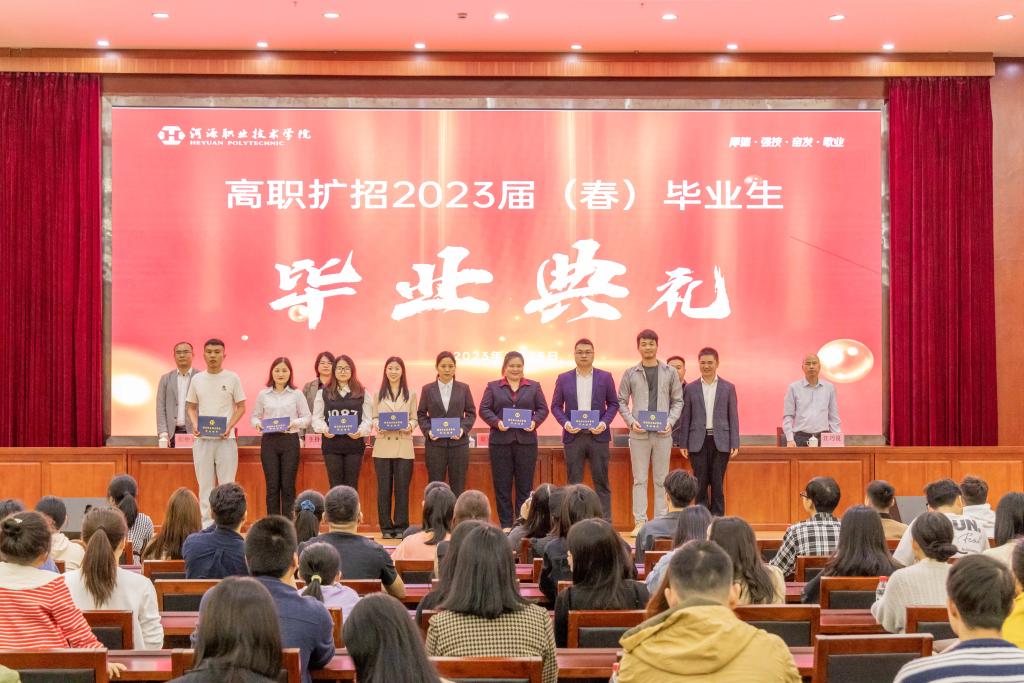 毕业典礼在庄严的国歌中拉开序幕。何燕飞处长宣读了学校《关于高职扩招2023届(春)毕业生毕业的决定》,袁光华副校长为毕业生代表颁发毕业证书。毕业生代表邹若雪同学和在校生代表张建勇同学分别进行发言。邹若雪同学喜悦之情溢于言表,向学校的悉心栽培表示衷心感谢,立志毕业后以青春之名,赴时代之约,脚踏实地,勇挑责任。张建勇同学表示将以毕业生为榜样,珍惜在校学习时光,学习好知识,掌握真本领。