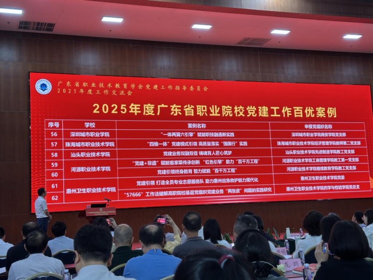 2025年5月24日,广东省职业技术教育学会党建工作指导委员会2025年度工作交流会在深圳信息职业技术学院召开。会议现场发布了2025年度全省党建工作百优案例。我校选送的《“党建+非遗”赋能客家菜传承创新,“红色引擎”助力“百千万工程”》《党建引领终身教育 智力赋能“百千万工程”》两篇案例脱颖而出,成功入选省级优秀案例,充分彰显学校党建引领高质量发展的创新成效。