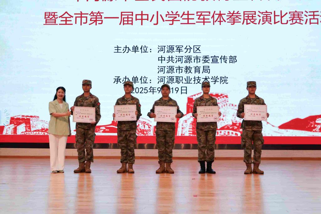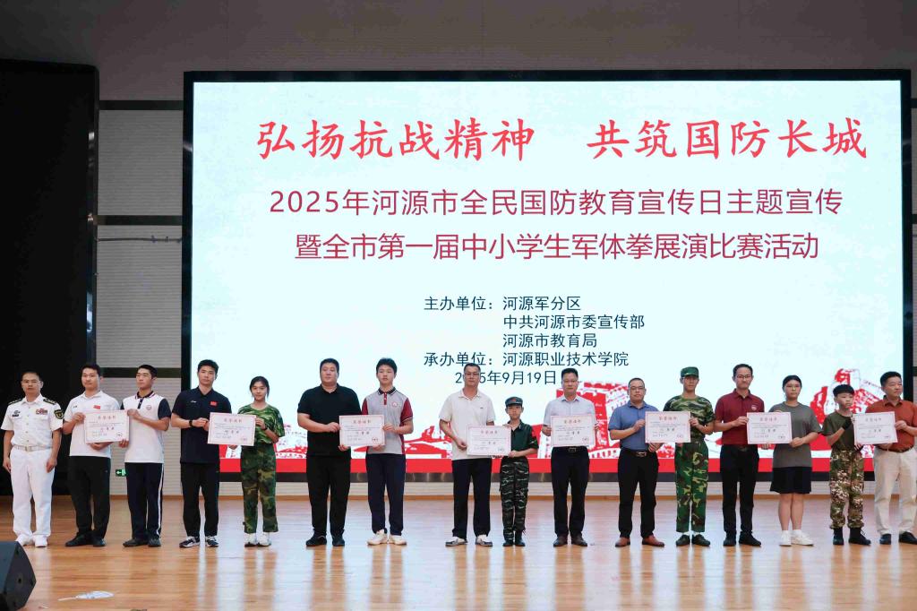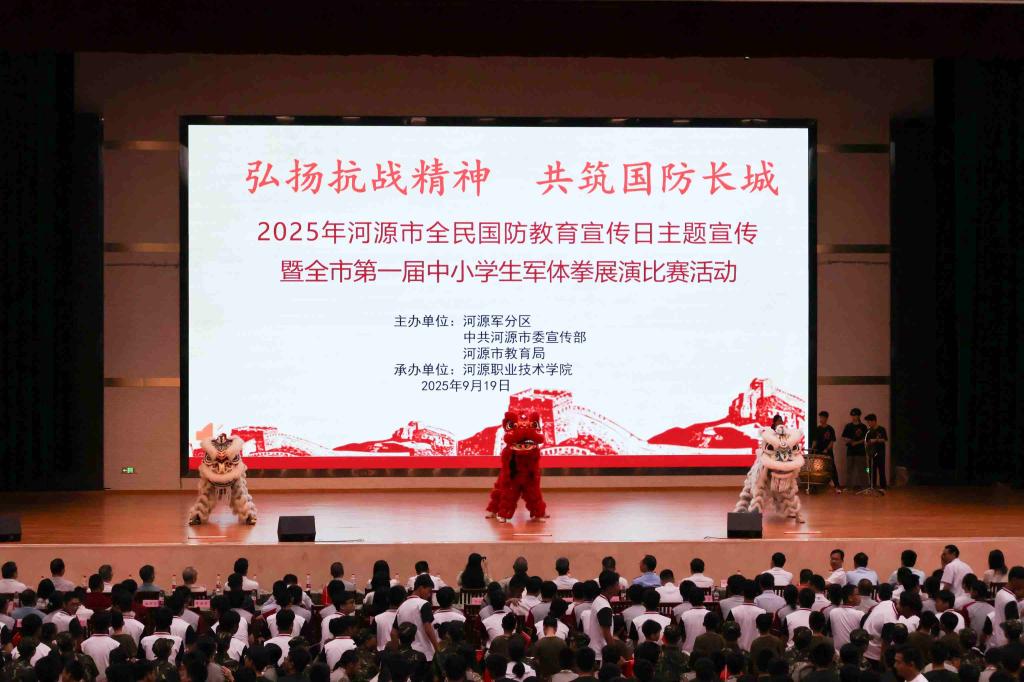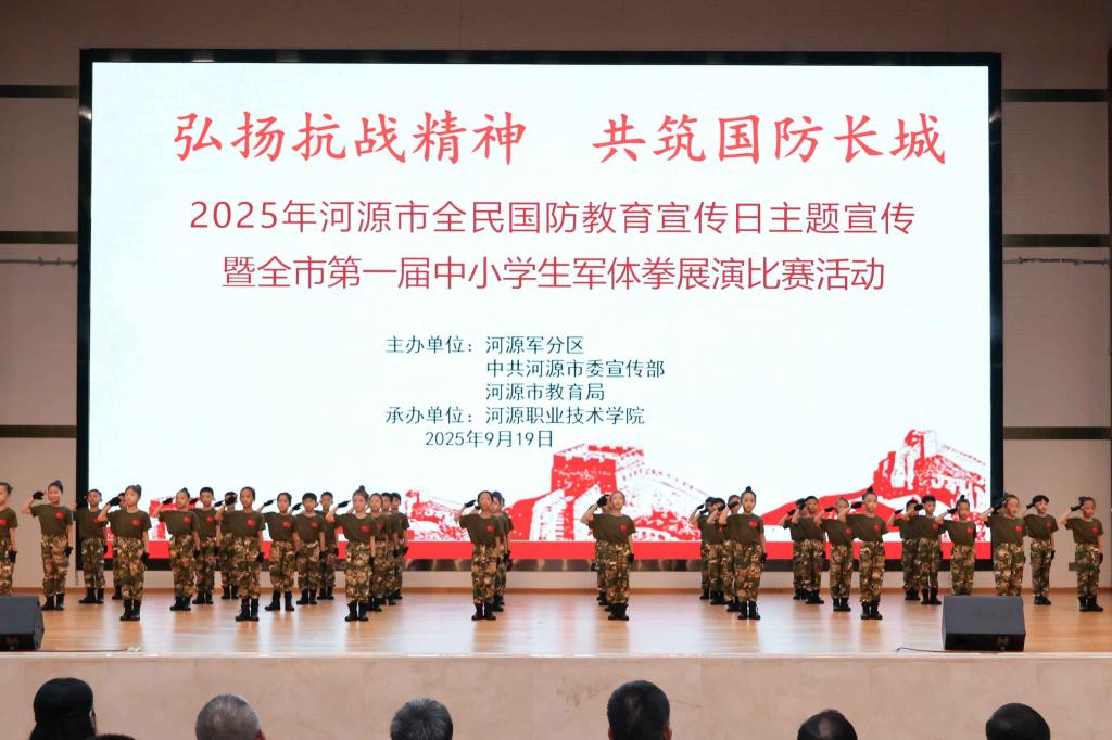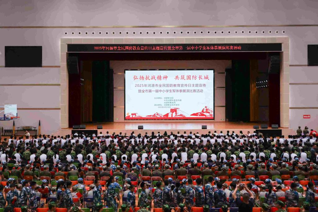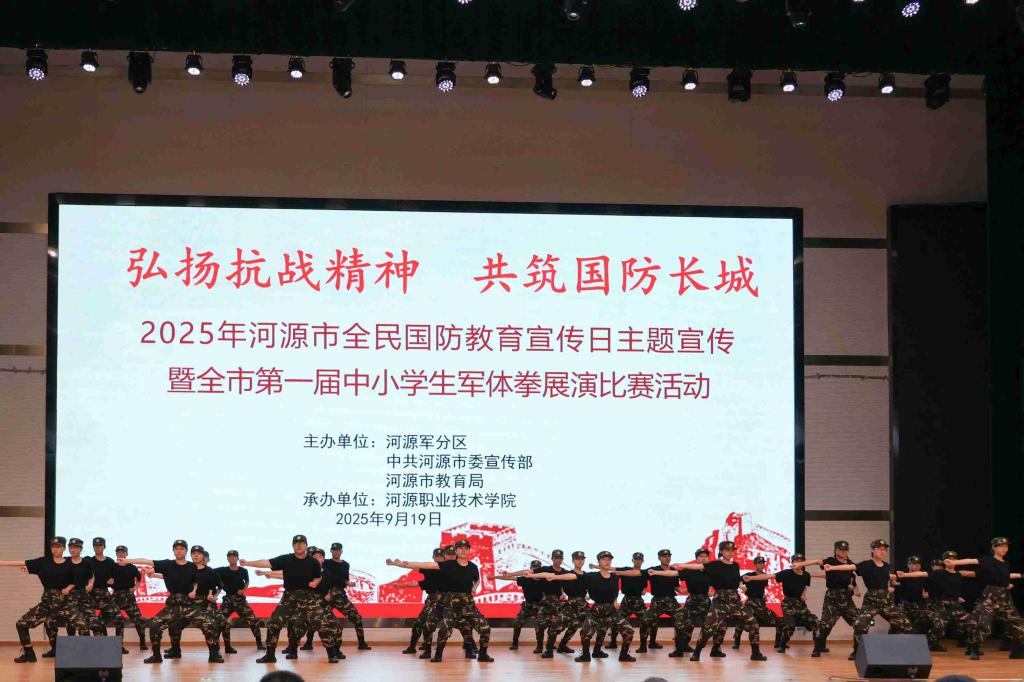 9月19日,我校在体育馆承办2025年河源市全民国防教育宣传日主题宣传暨全市第一届中小学生军体拳展演比赛活动。活动由河源军分区、河源市委宣传部、河源市教育局联合举办,依托融合军事训练与体育教育的军体拳项目,创新国防教育形式,拓宽国防教育渠道,切实增强学生国防意识和身体素质。市国防教育领导小组办公室各成员单位,各县、区教育行政部门分管领导,“国防教育示范学校、特色学校”校长,市直各学校校长,24支参赛学校代表队近1200人参加活动。