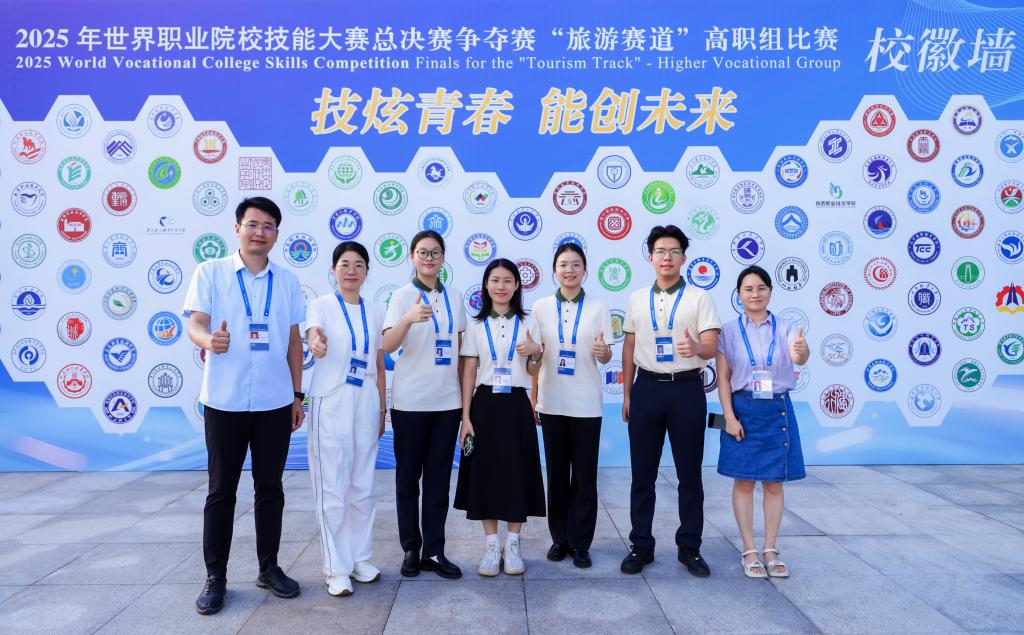 从备赛到夺奖,每一步都凝聚着全校上下的同心协力。学校领导高度重视,亲自指导,刘贻新校长、袁光华副校长、姚家芳副校长多次亲临训练现场指导和慰问师生,召开专题会议统筹资源,解决实际困难,明确“真实场景、真实任务、真实技能”的备赛导向;教务处根据竞赛通知建立竞赛三级组织架构和备赛方案,从人力、物力、资金等全方位提供保障,各相关职能部门和二级学院全力配合,工商管理学院与电子与信息工程学院院部领导、参赛团队师生更放弃整个暑假,战高温、磨方案、强技能,开展系统高强度集训。最终,在竞争最激烈的“旅游赛道”高职组比赛中,伍新蕾、谭健萍指导,陈钰婷、赵芷琪、陈心怡三位同学组成的参赛团队凭借作品《客雁归梅 寻根觅美》摘得金奖;餐饮、能源动力、土木建筑施工赛道三支队伍斩获银奖;旅游赛道研学旅行方向团队获铜奖,用实力交出亮眼答卷。